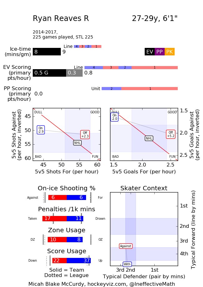 So, what can Reaves do well? He can play defense and suppress shots. He can cycle the puck a bit with the right players. He can skate. He can hit. So, if you love 8 minutes of that every night, while ignoring the fact that he's been a negative player his whole career despite that, good for you! If you love it at the price it came at, even better! I surely love the leeching of draft picks for no reason and the signing of veteran bottom 6 forwards that do nothing to help the team win. Cause that worked so well under Bylsma/Shero.
